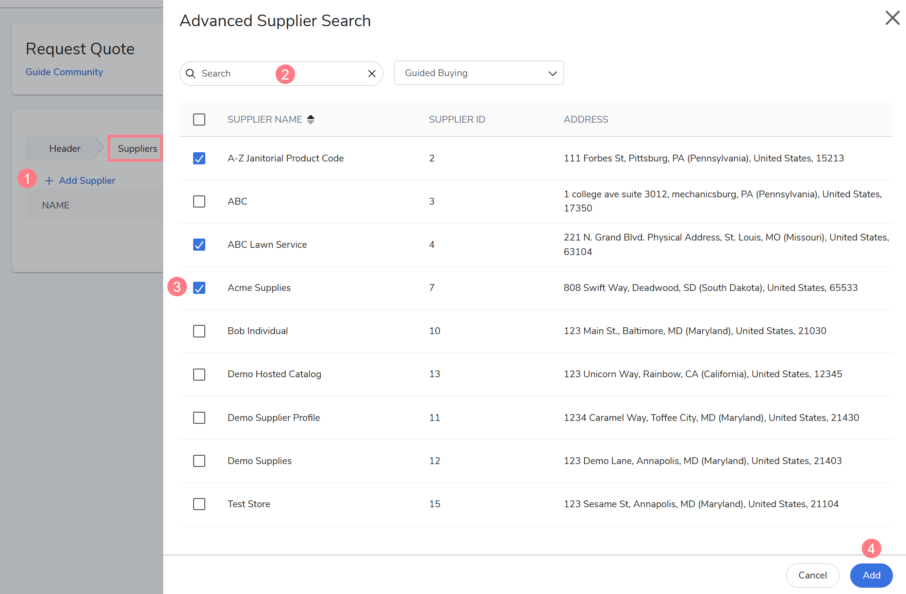 +Add Supplier. Use the Search field, or choose supplier(s) from the Guided Buying Collections field.
