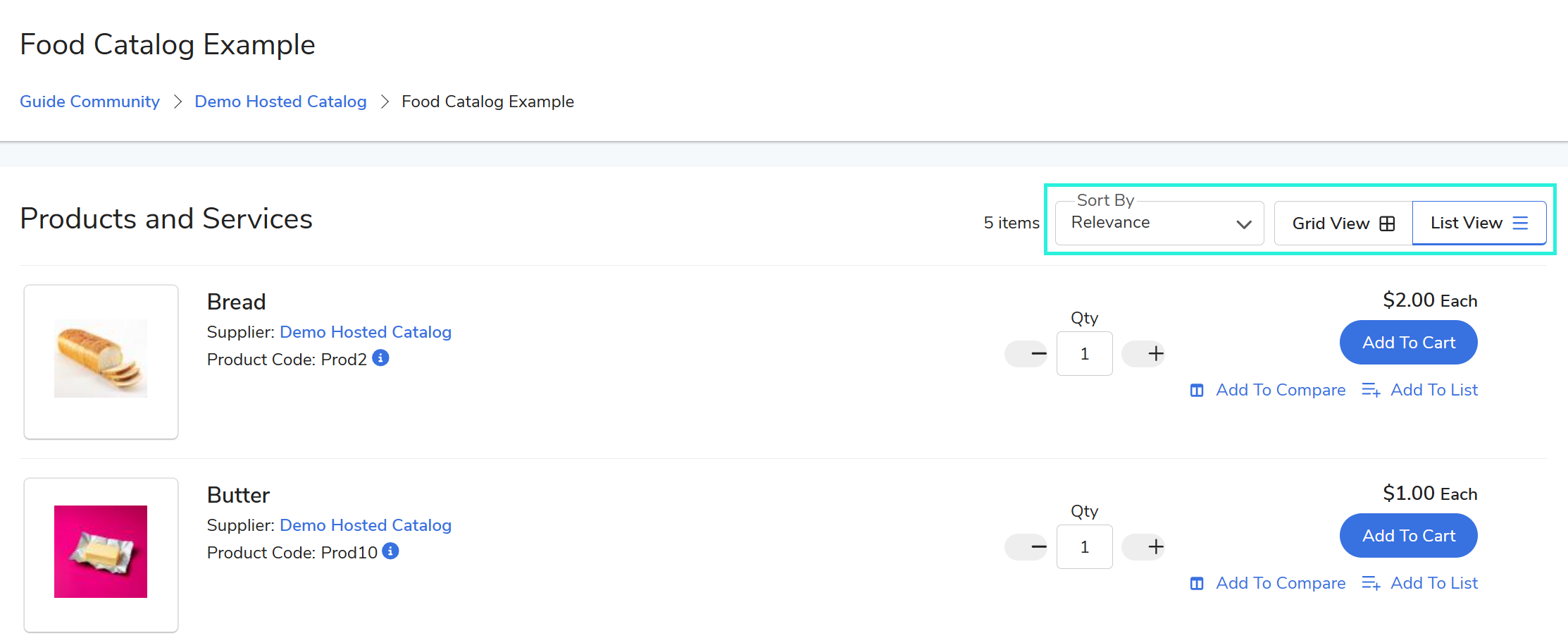Catalog browsing features include: Sort By (Relevance, Price, Name, Code), Grid View/List View, and Add to List.