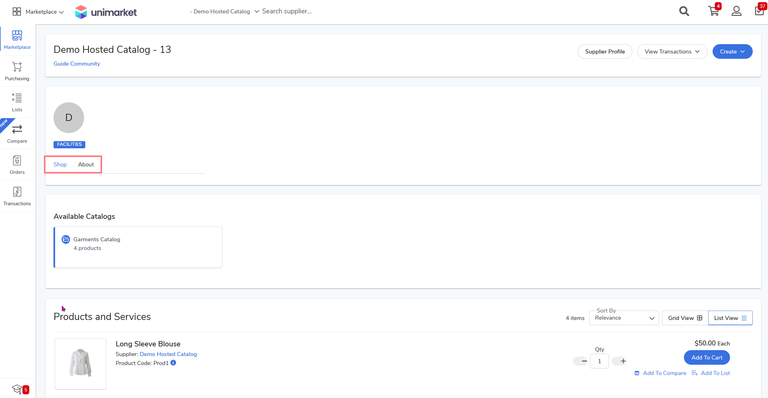 Hosted Catalog Suppliers: Users will see a Shop tab (to view the catalog/product listing) and an About tab (to view the supplier detail screen).