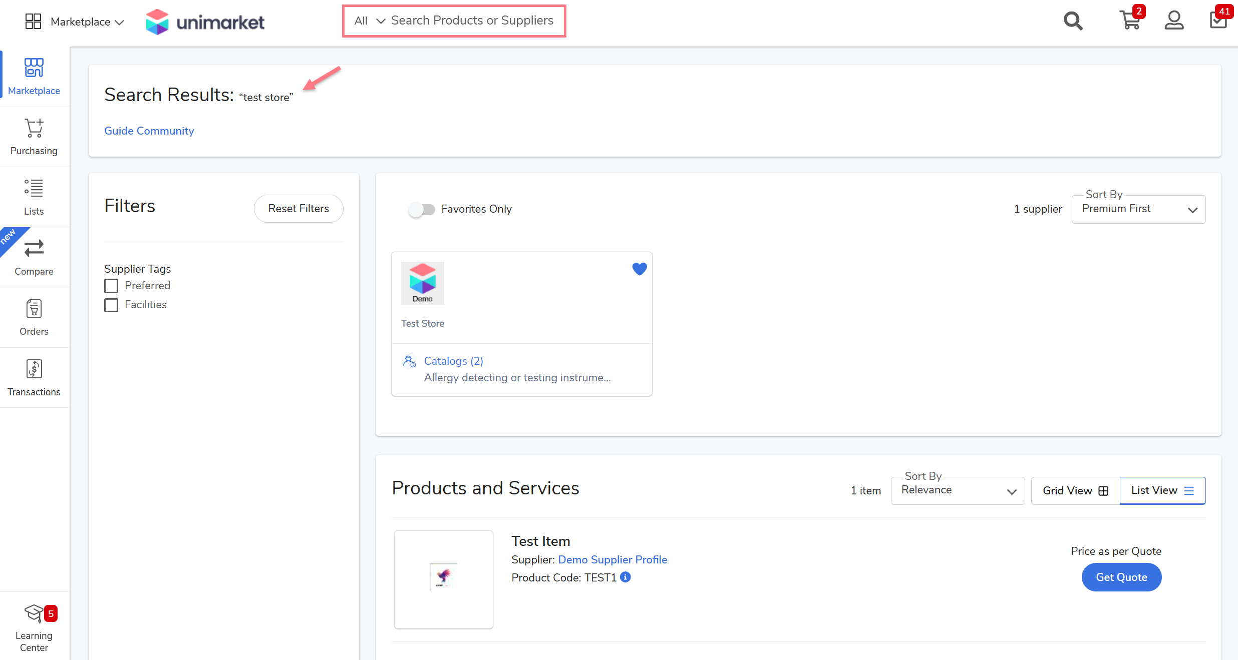 When the primary Search Products or Suppliers field is used, the Search Results screen populates. Displaying items that are the closest match based on:
