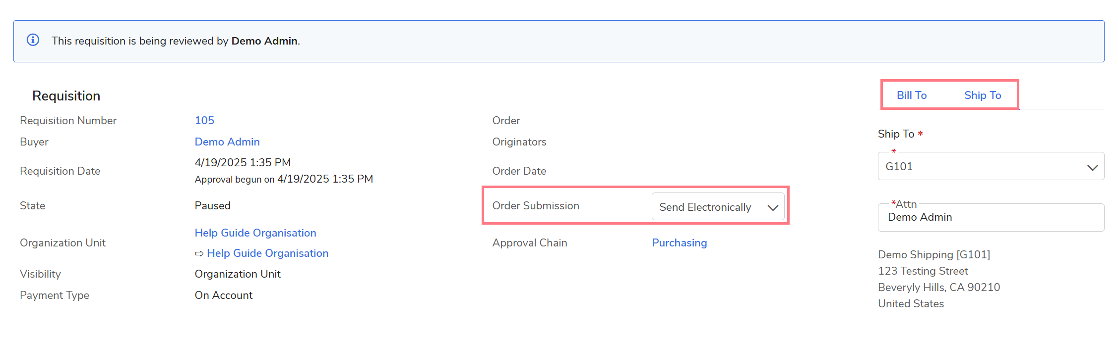 - Bill To/Ship To and Order Submission details