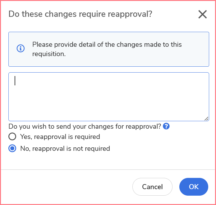 Automatic Reapproval: If the changes result in an increase in the requisition total, reapproval will be automatically required. For Account Code Changes, reapproval status will refresh automatically, and users do not need to select "Yes".