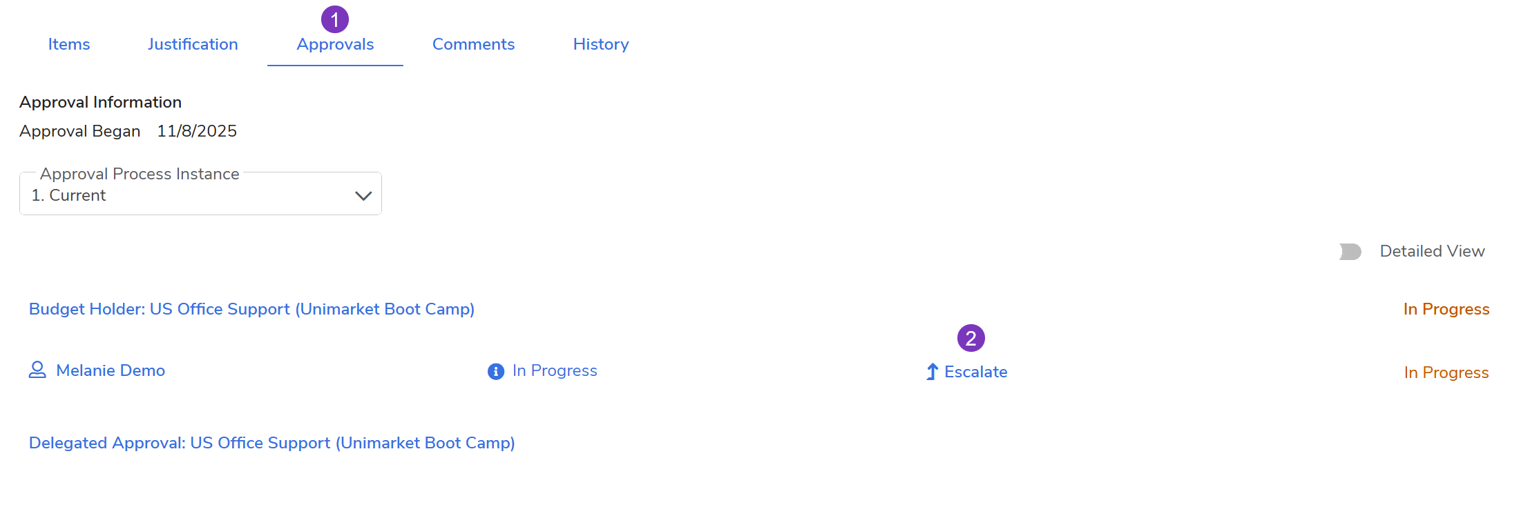 Once the feature is enabled, users with the Community Administrator or Escalate Approval role can escalate a Pending requisition: