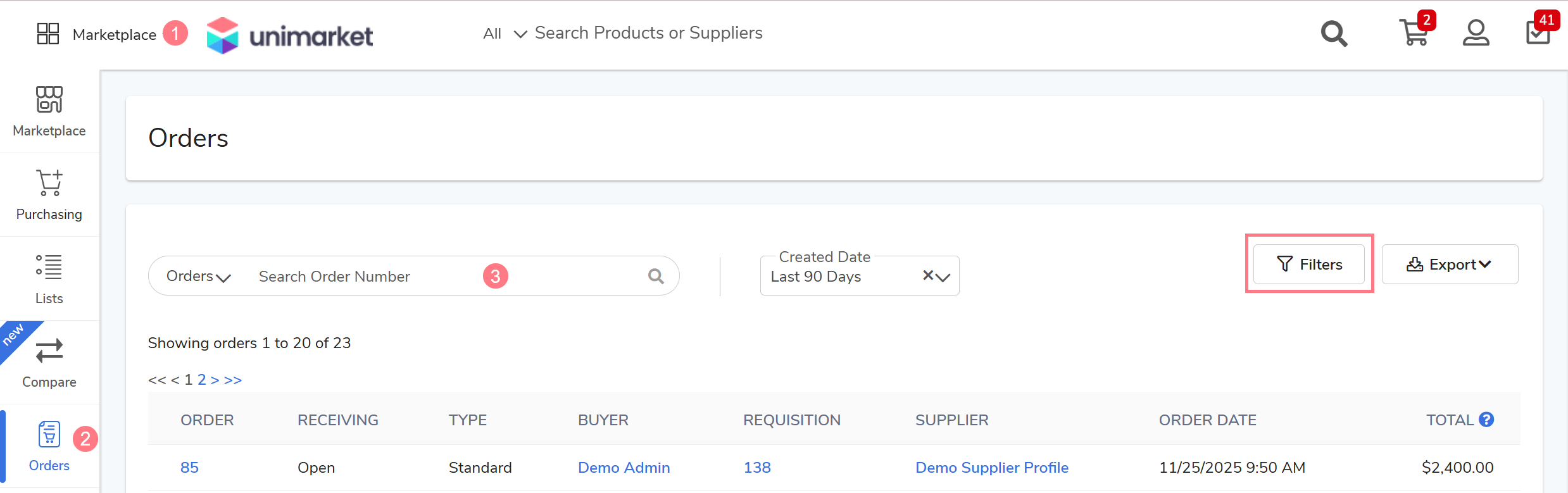 Find the desired order by entering the number in the Search Order Number field or by utilizing Filters to customize your search.