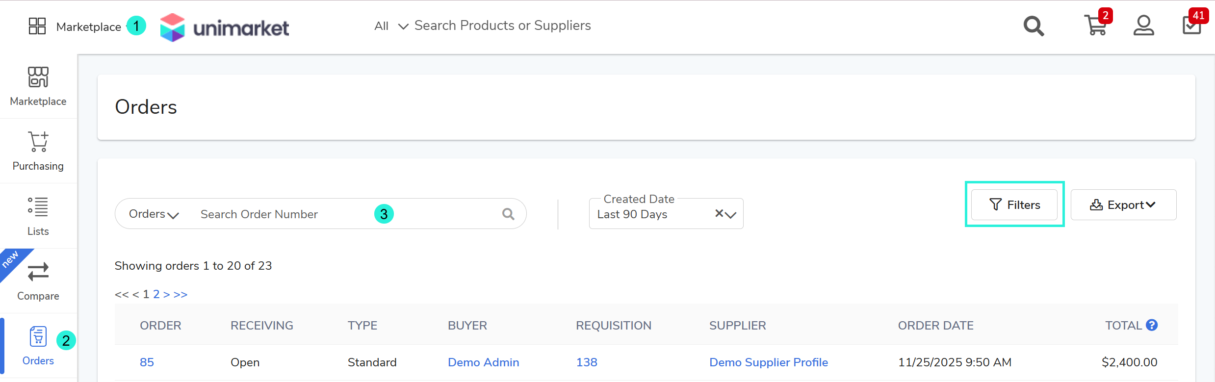 Find the order by entering the number in the Search Order Number field or by utilizing Filters