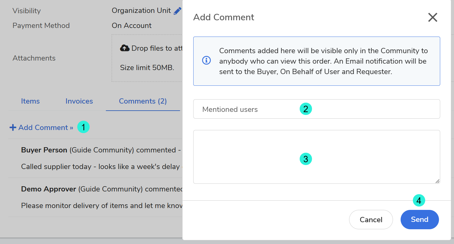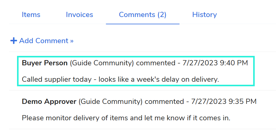 The Comments tab is a vital internal tool available in all order types (including Blanket Orders). That allows any user who can view the order to include notes, track essential details, and communicate with other internal users. Comments are only visible within the Community and are not shown to the supplier.