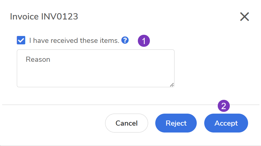 Confirm Receipt: In the pop-up box, check the I have received these items box to receive all goods along with accepting the invoice.