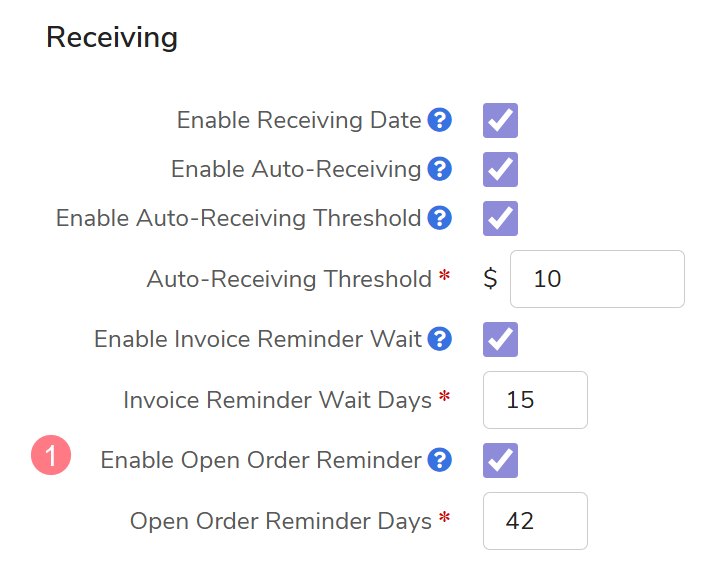 The Open Order Reminder setting automatically triggers an Outstanding Receiving task for buyers if an order remains open (not received or partially received) for a specified number of days.