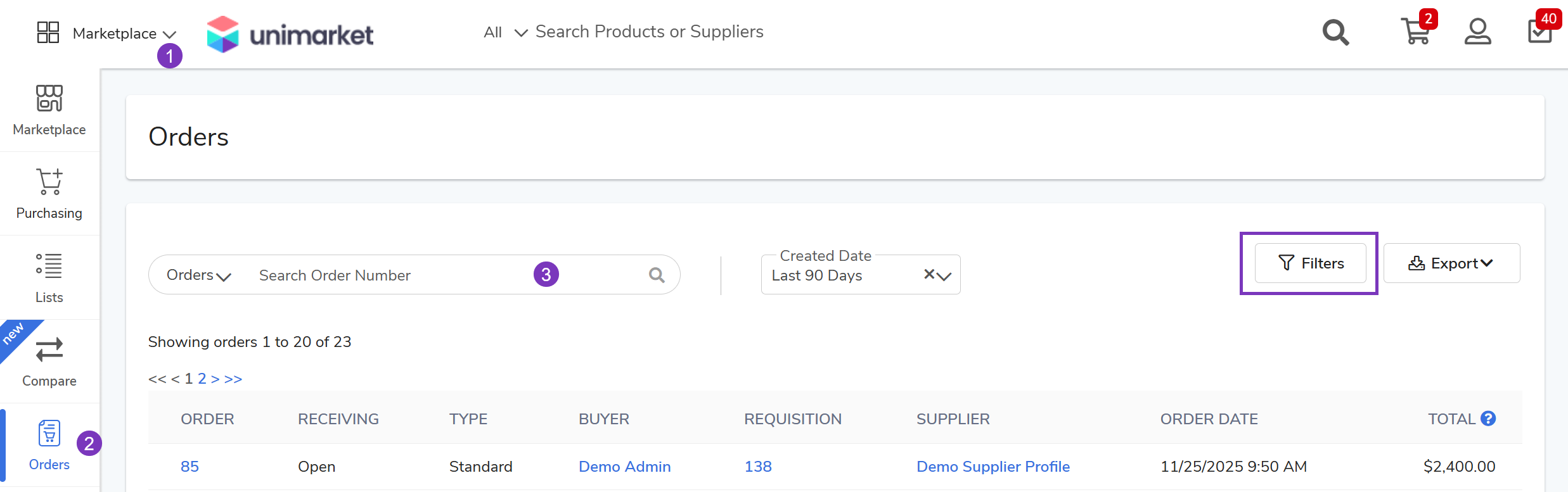 | 1. Access Order | Marketplace > Orders | Use the Search Order Number field or customize the search using Filters > in the Receiving field, select Closed > click Apply Filter. |