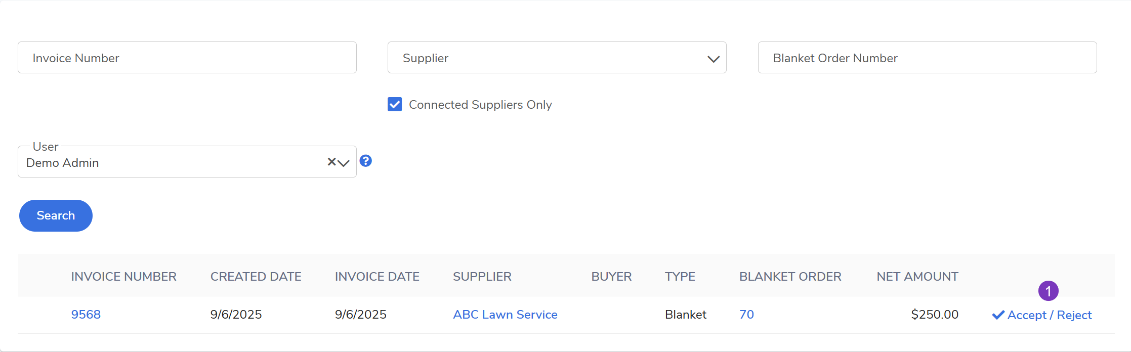 Accept/Reject Invoicesscreen will populate. Enter the invoice number in the Invoice Number field or the Blanket Order number in the Blanket Order Number field > select Search.Open Invoice: Click Accept/Reject.