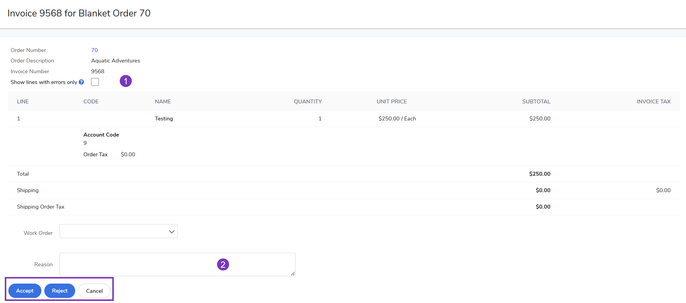 Invoice for the Blanket Orderscreen will populate.Show Lines With Errors Only: This box must be unchecked to accept the invoice.