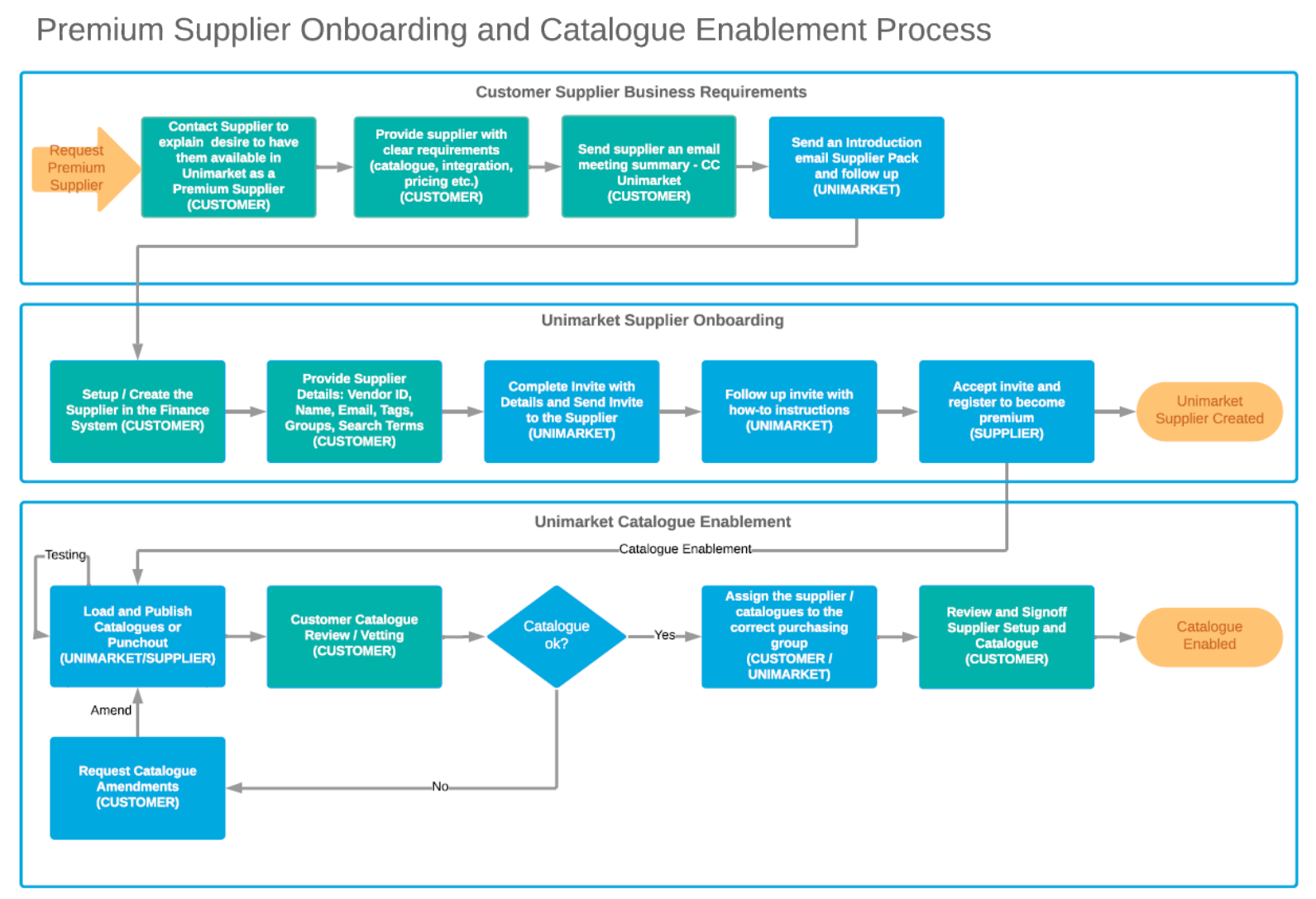 Unimarket supports its customers by managing the process of onboarding new premium catalog or integrated suppliers, throughout the life of their contract. The Supplier Enablement team will work closely with the customer and the supplier, to manage the process from start to finish.