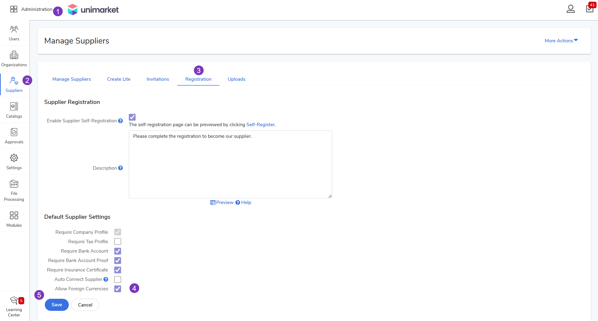 Administrationmodule > select Suppliers.Access Settings: Click the Registration tab.