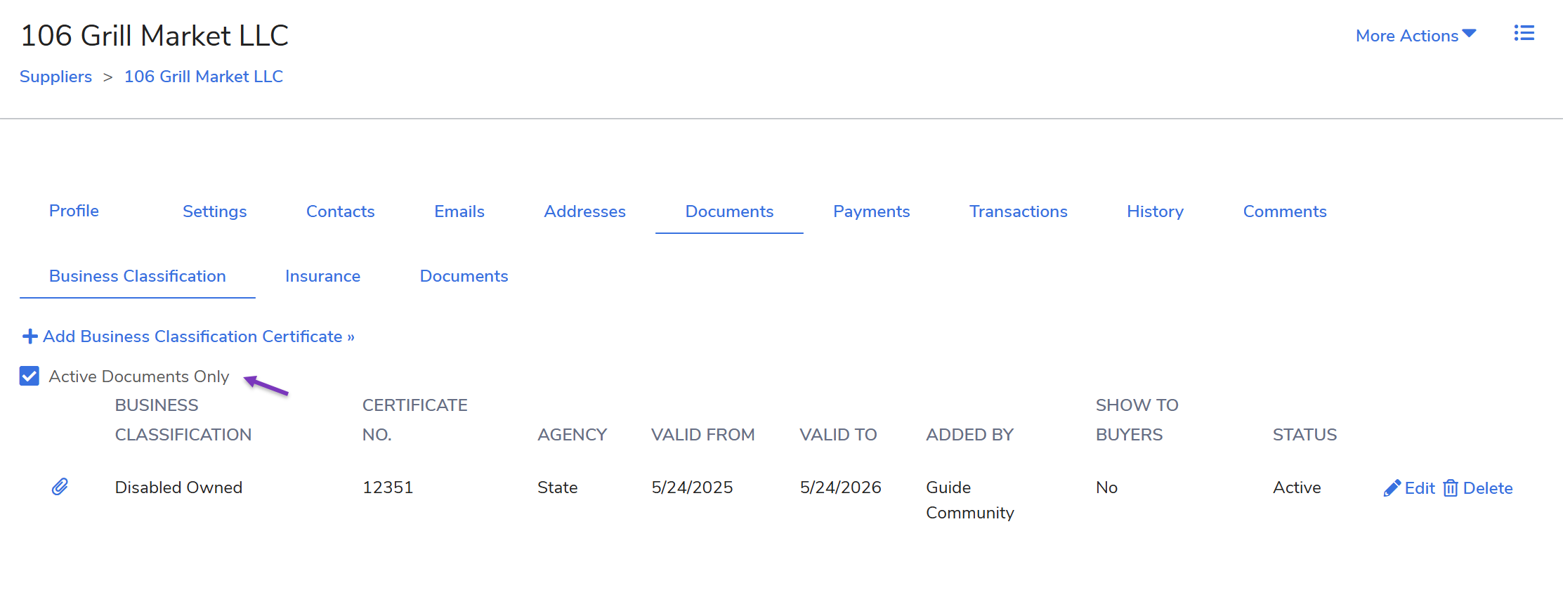 By default, the system is set to Active Documents Only. When a document is deleted by either the Community or the supplier, it remains in the system under an Inactive status.