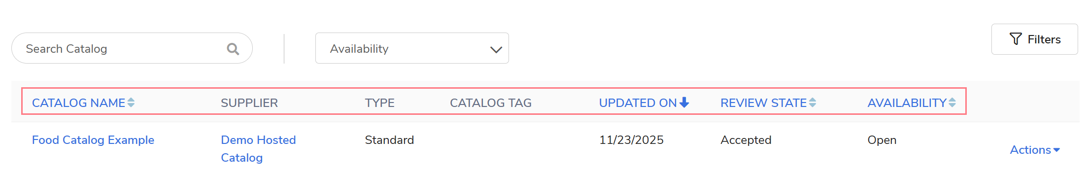 | Availability | Indicates if the catalog is live (Open), hidden (Needs Buyer Group), Declined, or Expired. |