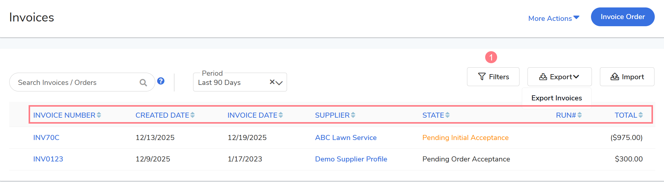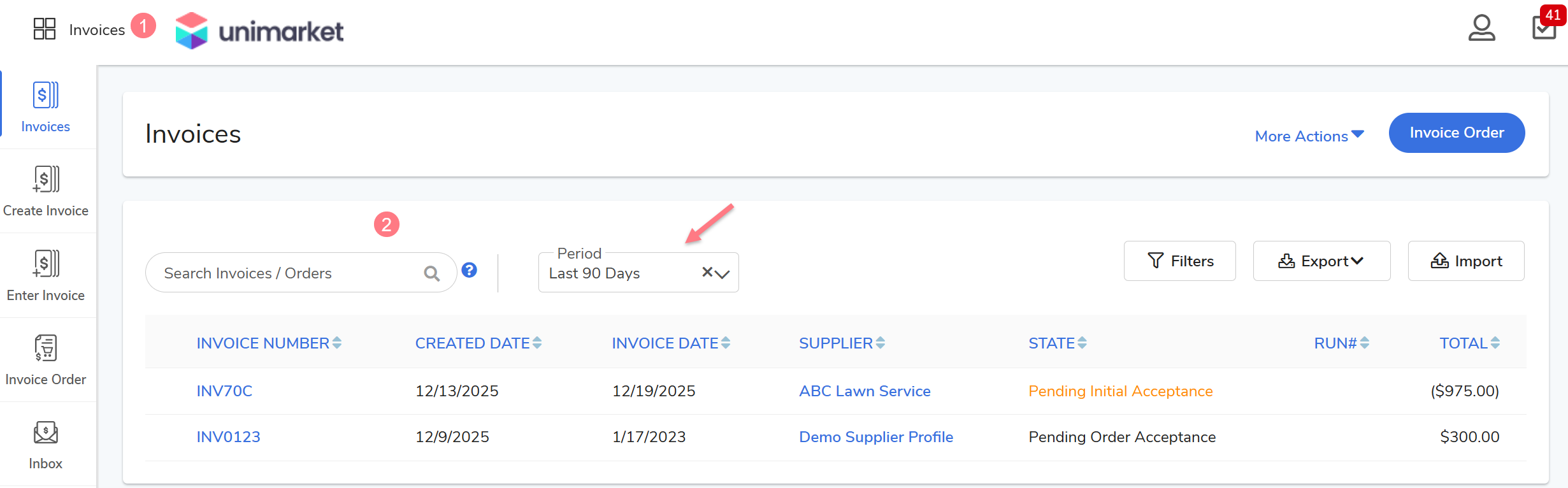 Default View: By default, the screen displays invoices from the last 90 days. You can customize the date range by selecting the dropdown in the Period field.