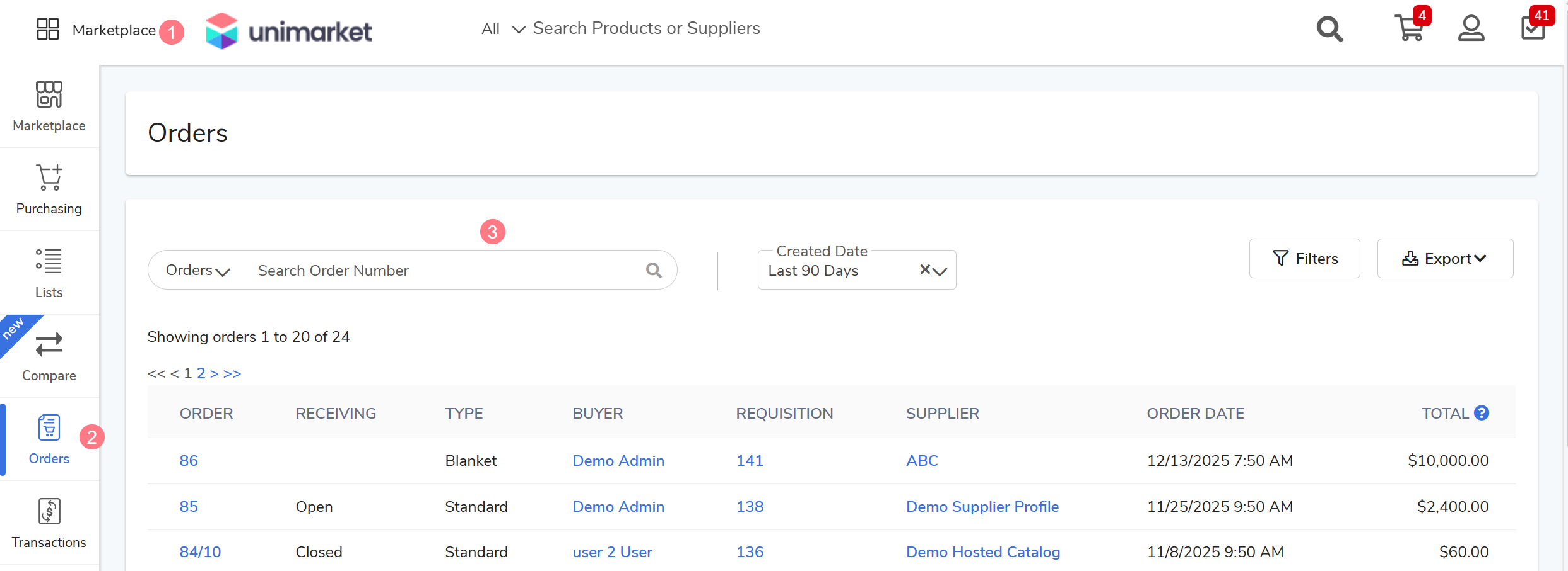 1. Locate Order: Go to the Marketplace module > select Orders. Locate the desired order (using the Search Order Number field or Filters) > click the desired order number.