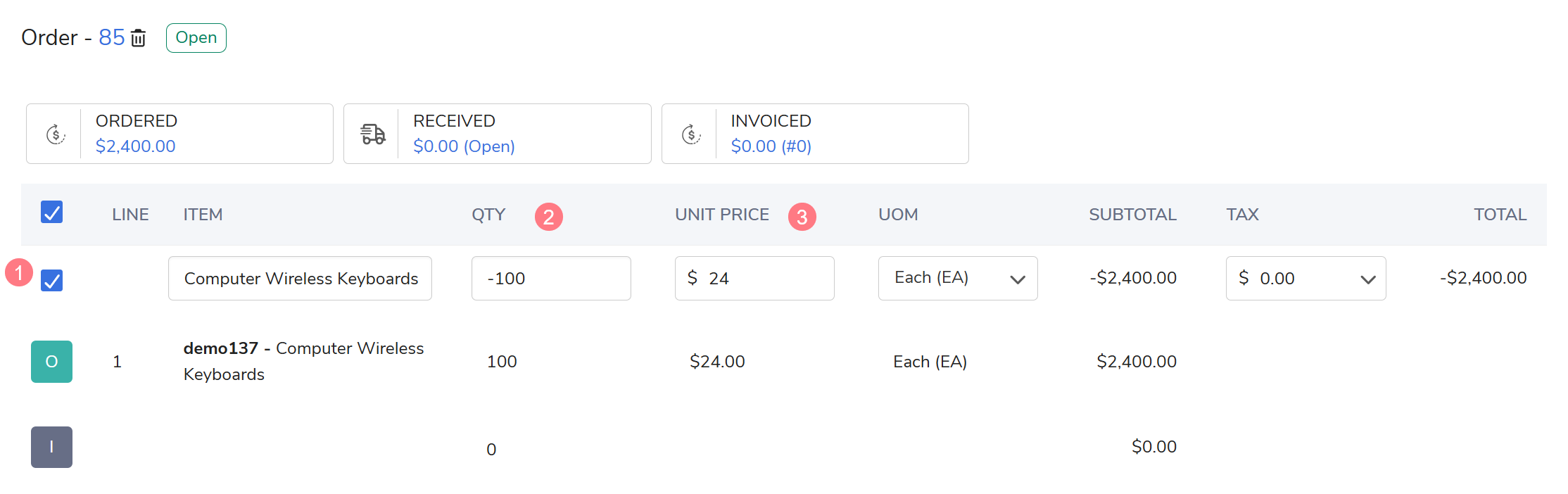 • Quantity: In the Quantity field, enter a NEGATIVE quantity (e.g., $-5$) to indicate the number of items being credited.