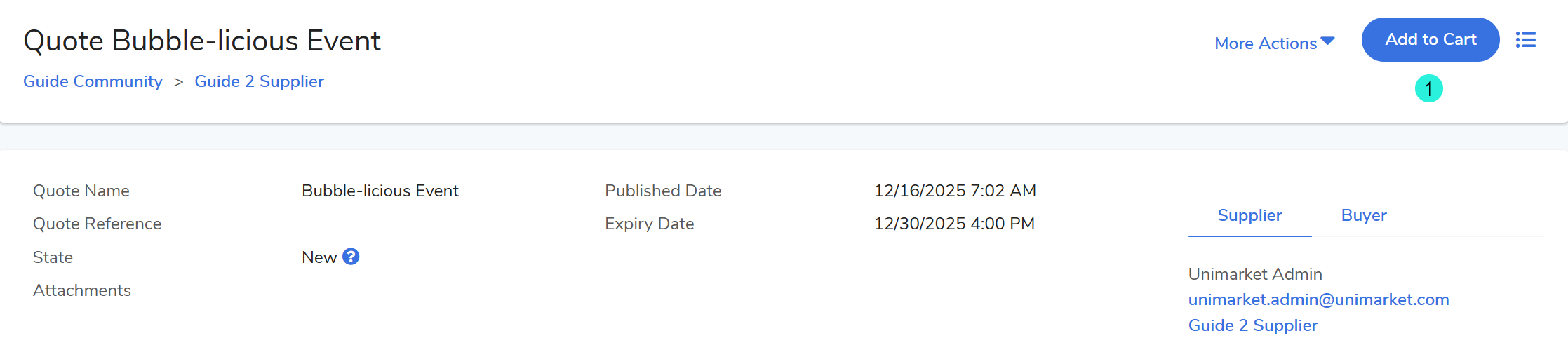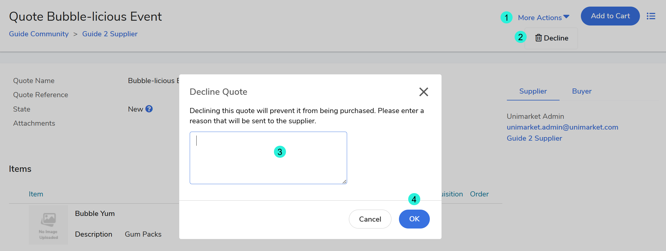 Suppliers may initiate quotes directly within Unimarket, in response to requests sent outside the system (e.g., for specialized products, discounted bulk orders, services, or one-off inquiries).