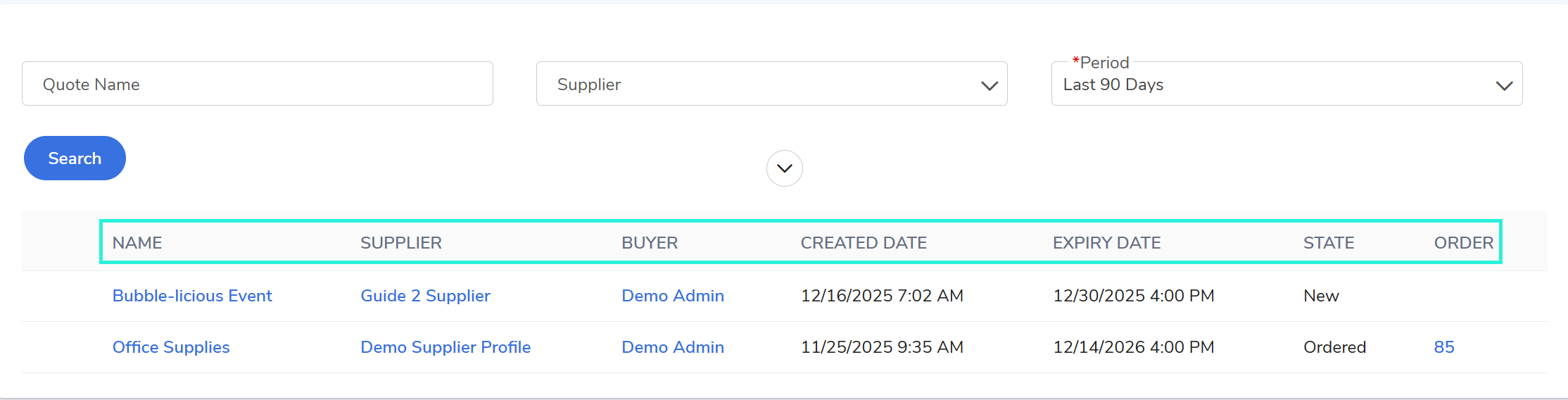 View Details: Locate the desired quote using the Quote Name, Supplier, and/or Period field. Once located, select the quote name to view the details.