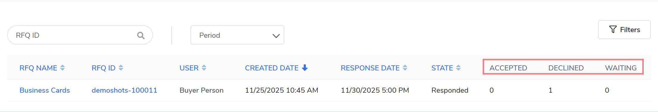 View Details: Locate the desired RFQ using the RFQ ID search field, Period field, or Filters. Once located, select the RFQ name.