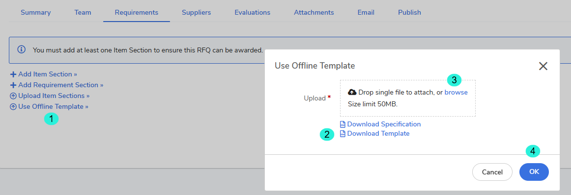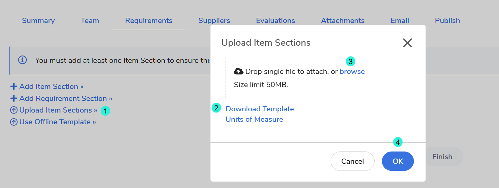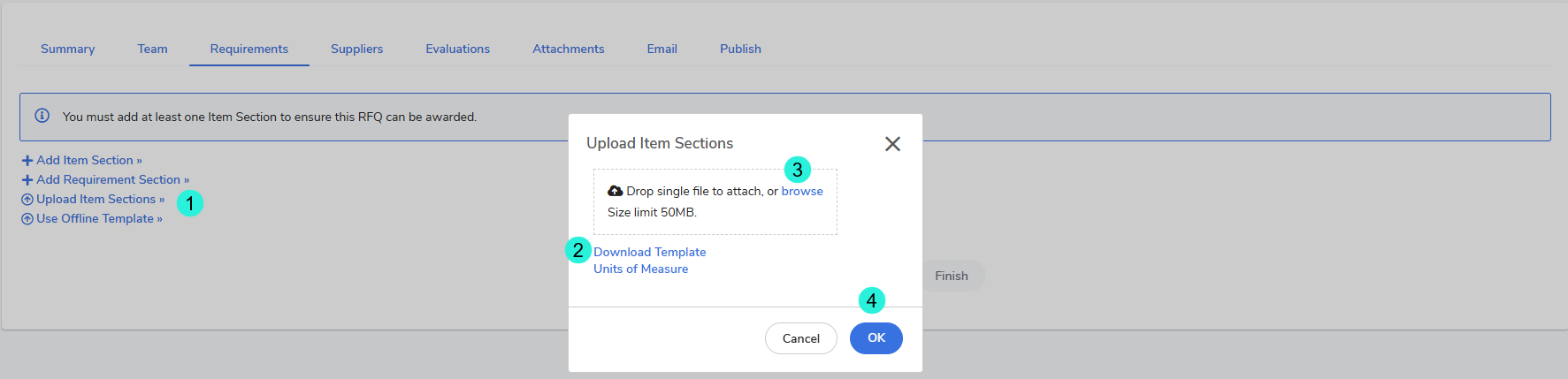 Next Step: Once the Item Section upload is complete, you must manually add requirements for each section. Then, select Continue to proceed to the Suppliers tab.