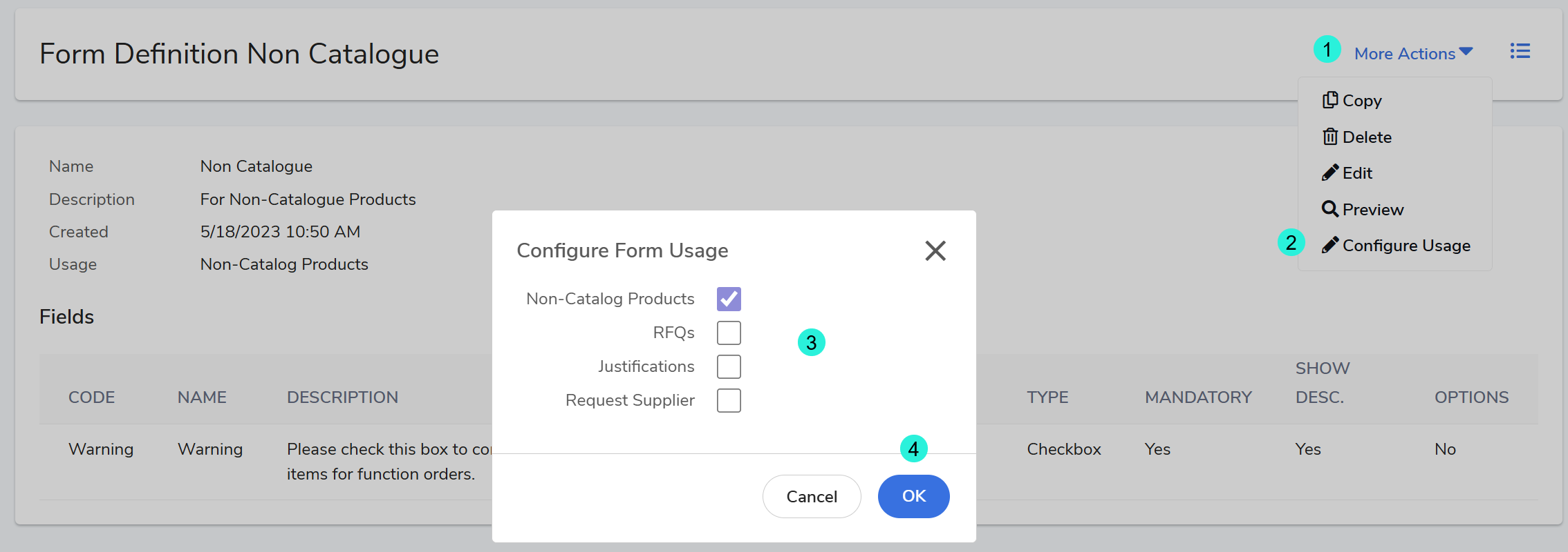 Configure Usage: Allows setting where the form will be used (Non-Catalog, RFQ, Justification, Supplier Request).