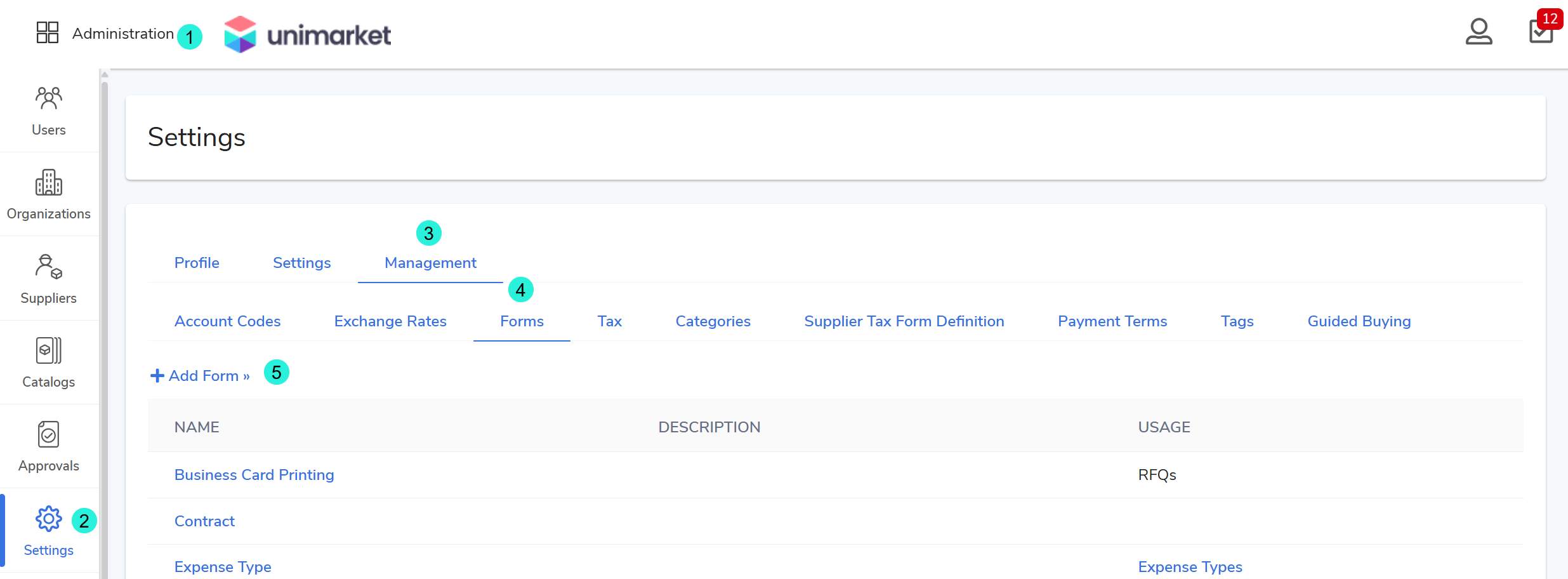 Administrationmodule > click Settings > select the Management tab > click the Forms tab.Add a Form: Click +Add Form > a pop-up window will appear to enter the form name and description (optional).