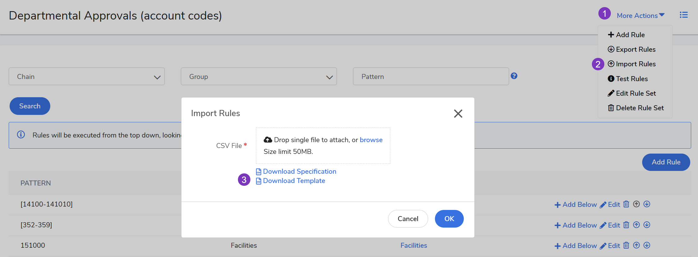 Full Replacement: Importing this file will delete all existing rules for that specific rule name and replace them with the content of the CSV.