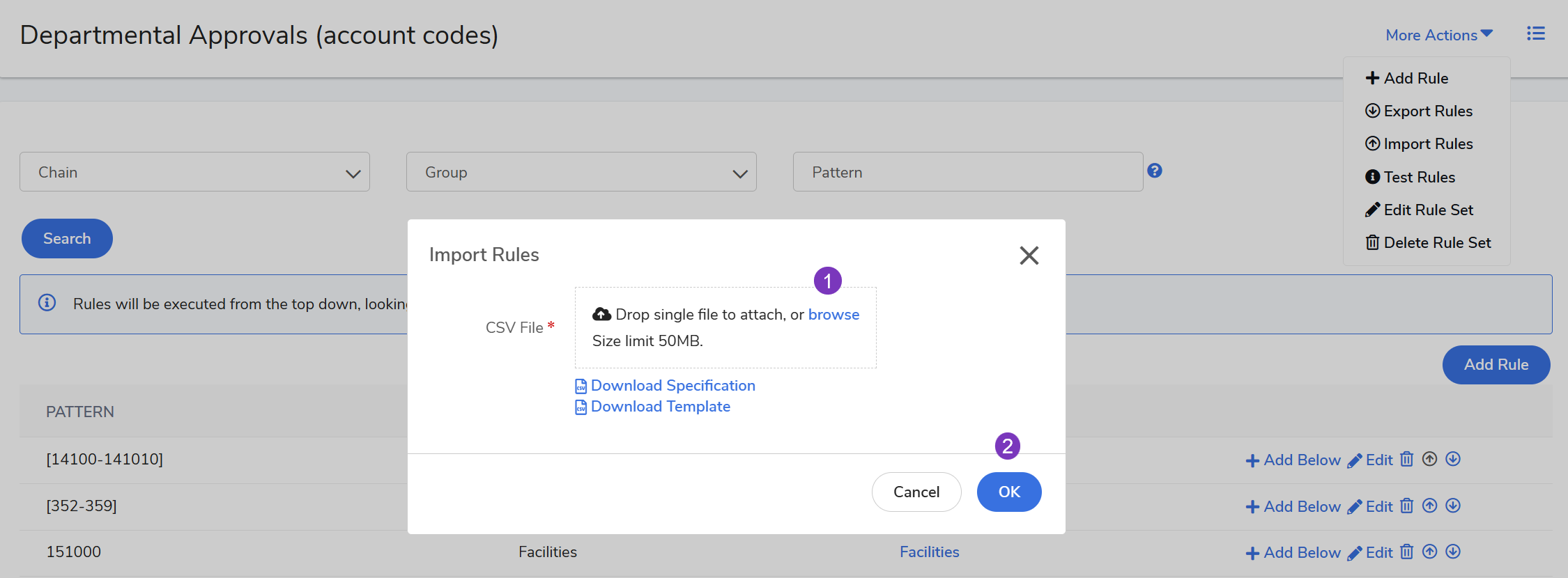 Click More Actions > Import Rules.