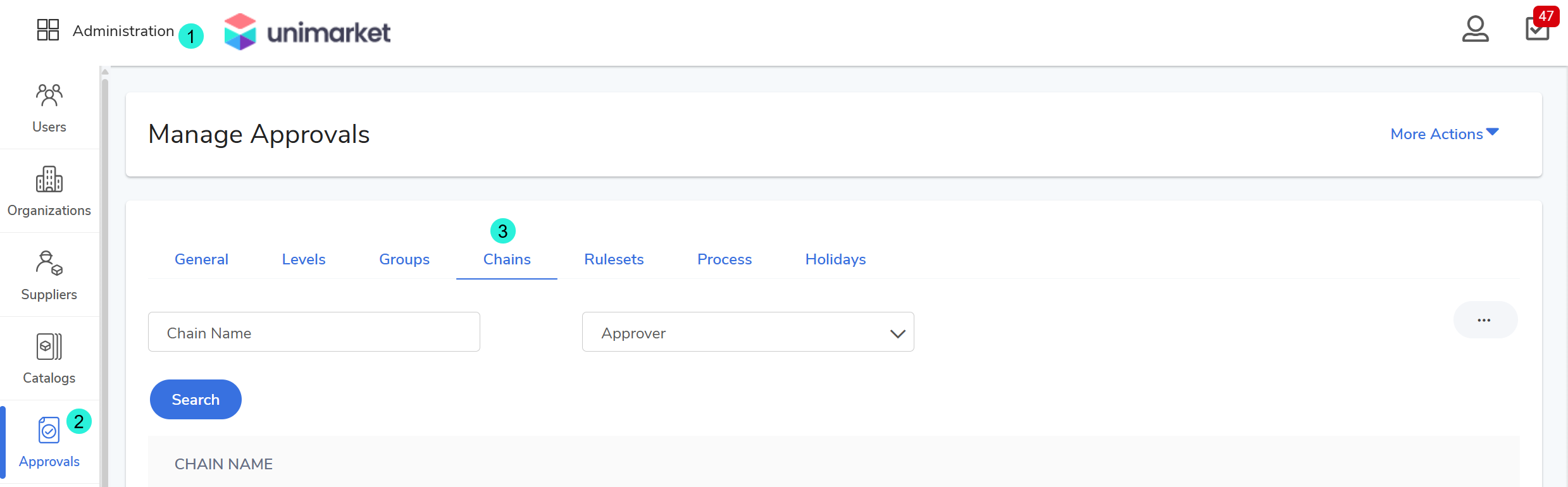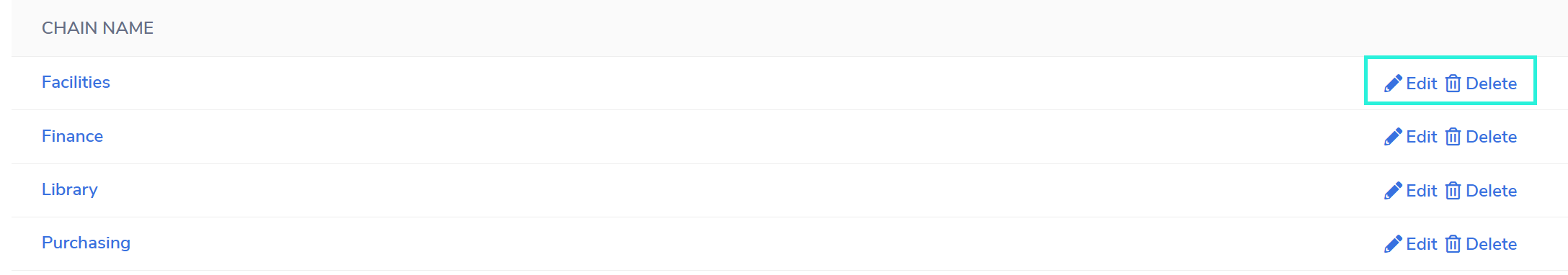 To manage chains, go to the Administration module > Approvals > Chains tab.