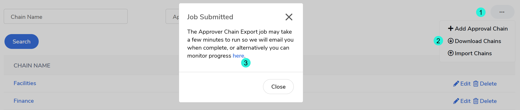Export: Click the three dots > Download Chains > select the here hyperlink. You will be directed to the Background Jobs screen to download the CSV file once it has finished processing.