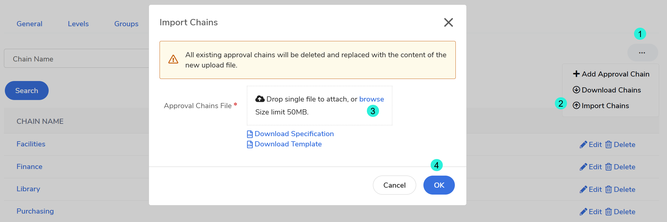 Warning on Imports: Importing a file will delete and replace all existing approval chains with the content of the new file. Ensure the file is complete before uploading.