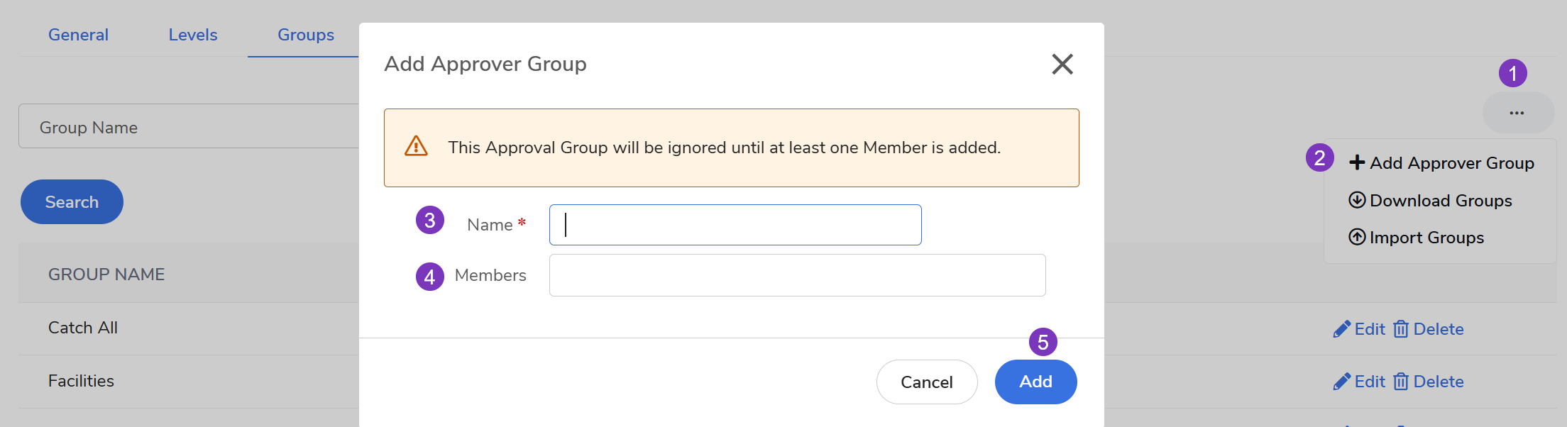Add a Group: Select the three dots (ellipsis) on the right side of the screen and click Add Approver Group. Enter the group name and select the members in the pop-up window.