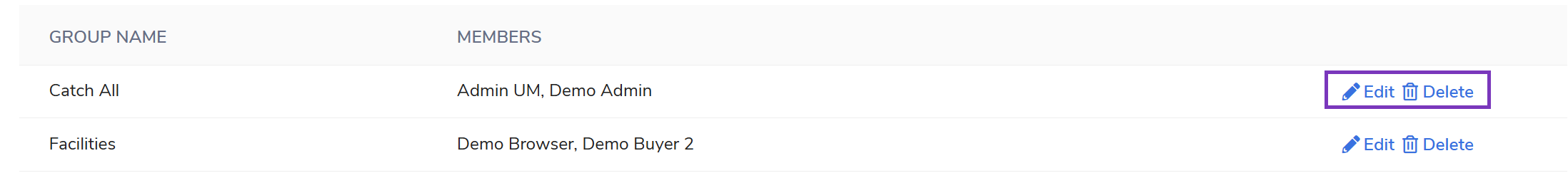 Edit or Delete: Existing groups can be modified or removed by selecting the Edit or Delete options next to the specific group.