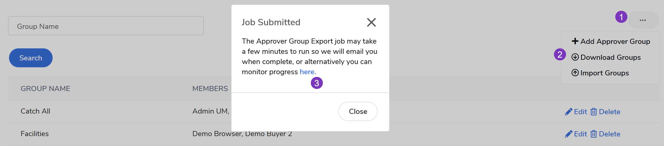Export: Select Download Groups to receive a spreadsheet of all current groups. Once the Job Submitted pop-up box appears, select the here hyperlink.