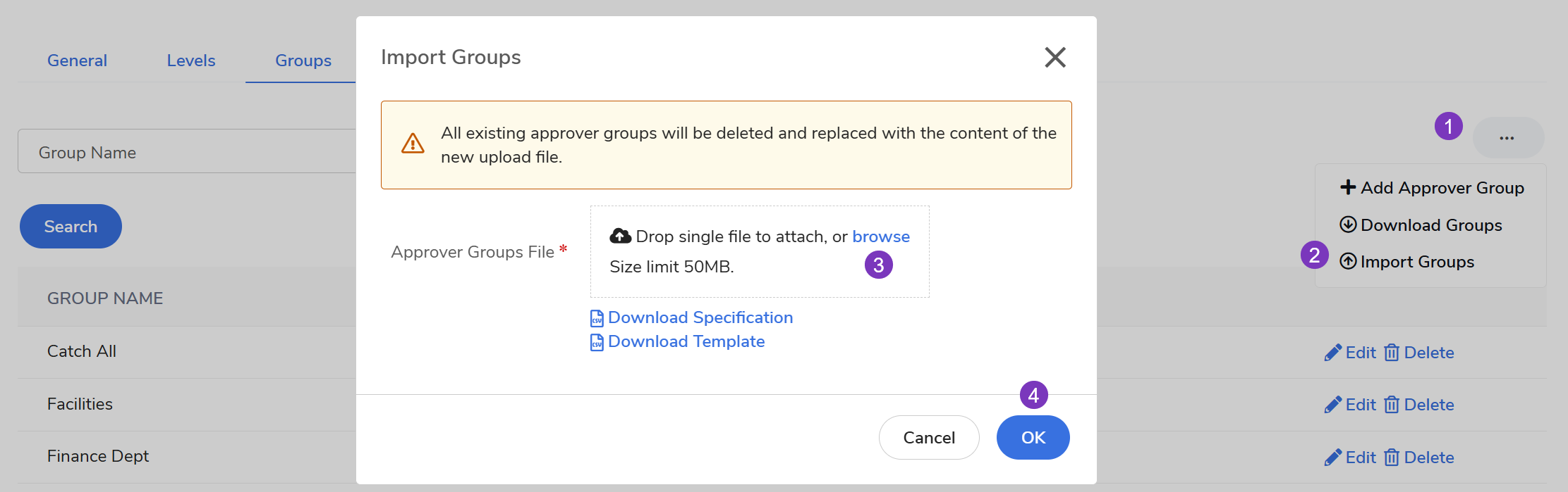 Warning on Imports: When importing, ensure the file includes all groups you wish to keep. Any group missing from the upload will be automatically deleted from the system.
