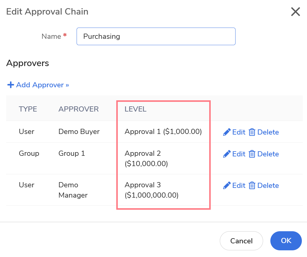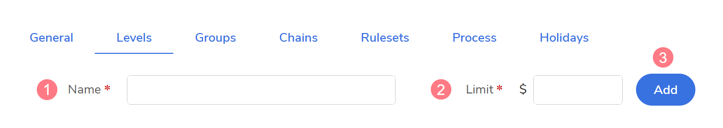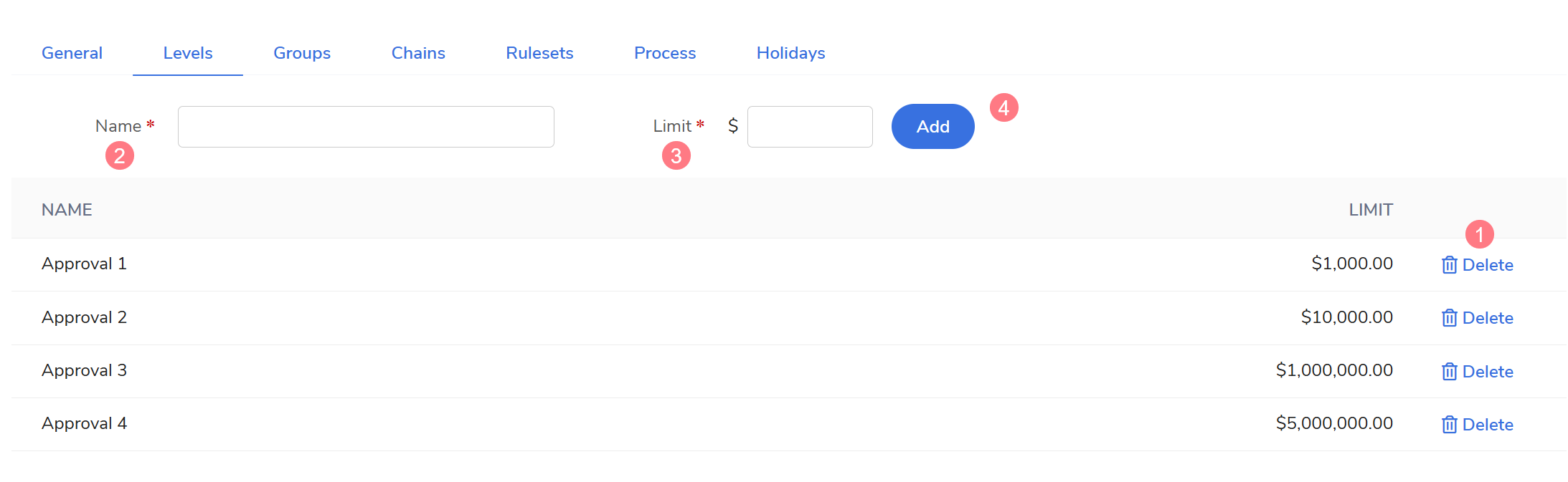 Delete: Select Delete next to the existing level to remove it. This is only possible if the level is not currently in use within an Approval Chain or as a self-approval limit.