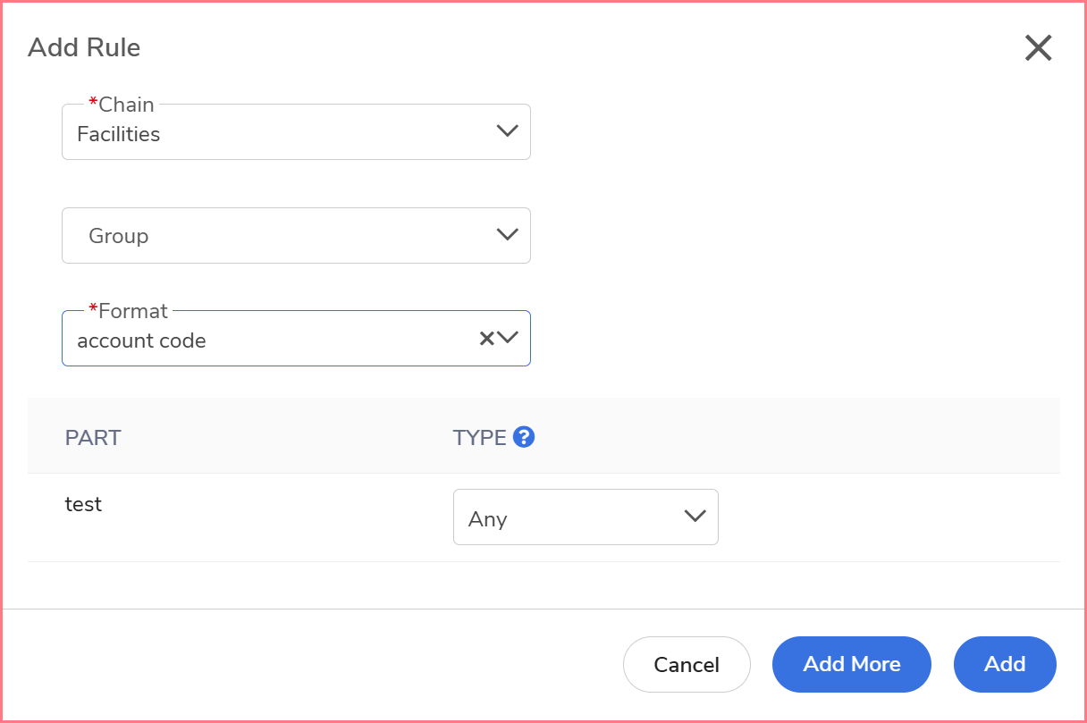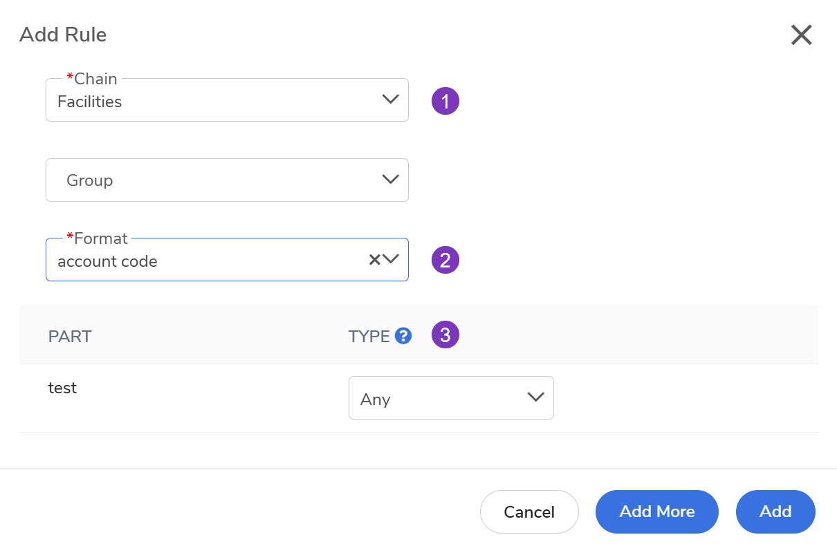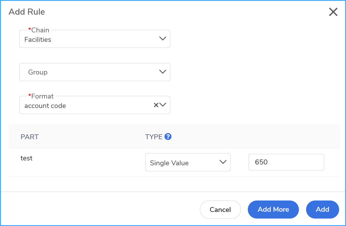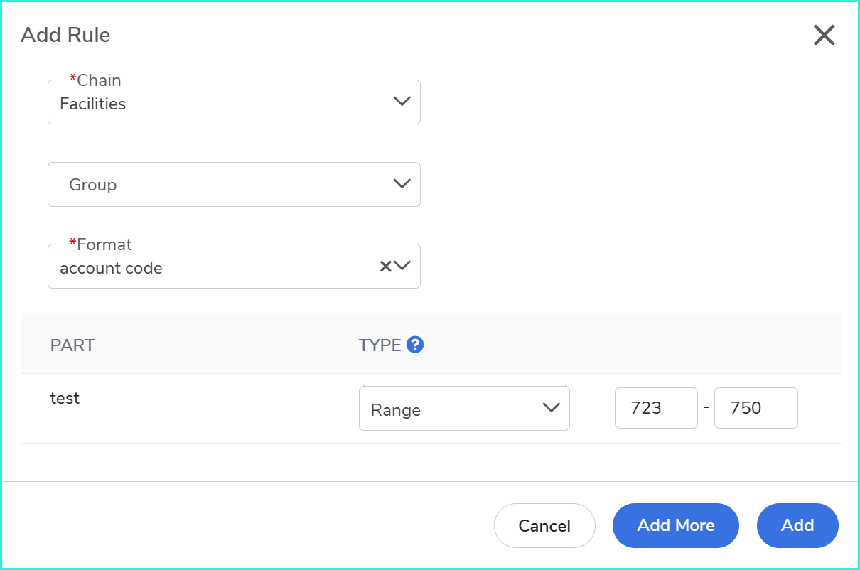 | Range | Use this to capture a series of codes (e.g., Accounts 1000 through 2000). You must provide both the Lower and Upper bounds. | Routing codes "723-750" to the Facilities chain. |