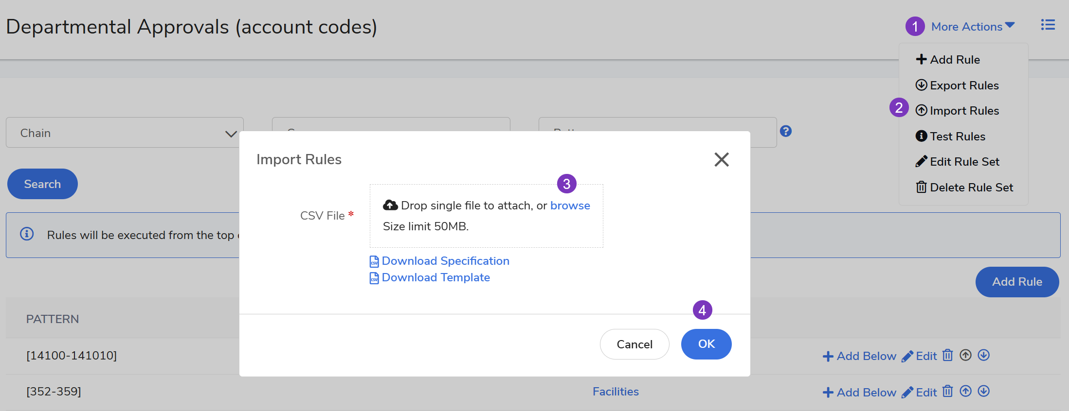 Import: Select More Actions > Import Rules and upload your updated CSV, by selecting Browse. Once completed, select OK.