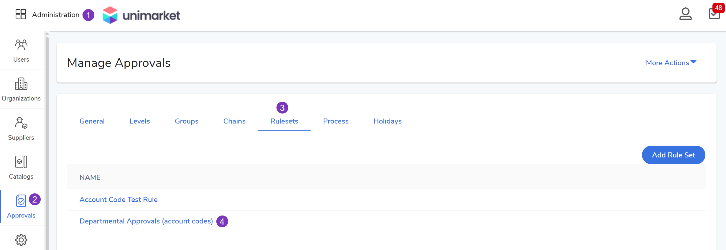 - To add a ruleset, go to Administration > Approvals > Rulesets tab and select the rule name.