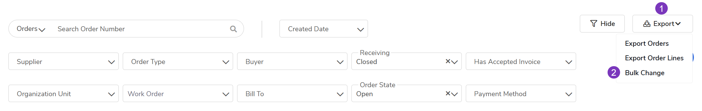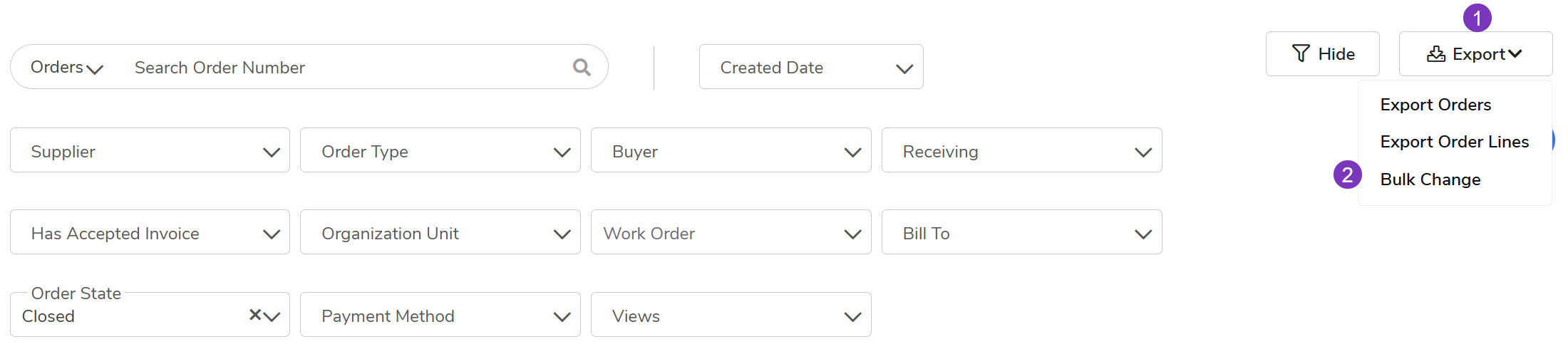 | Bulk Reopen | Closed | Receiving Status: Closed OR Has Received Invoice: Yes |