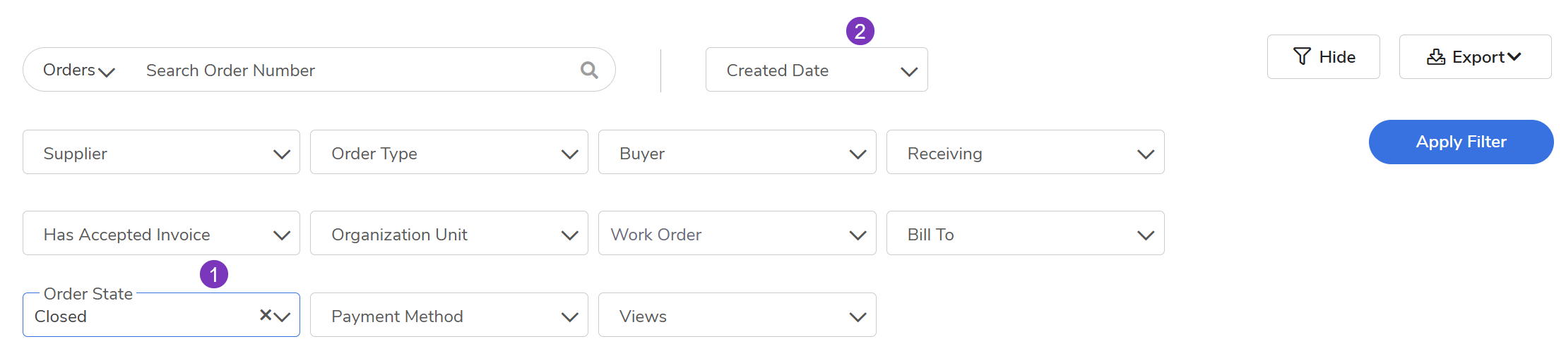 Important: Clear the Created Date field to see all eligible orders.