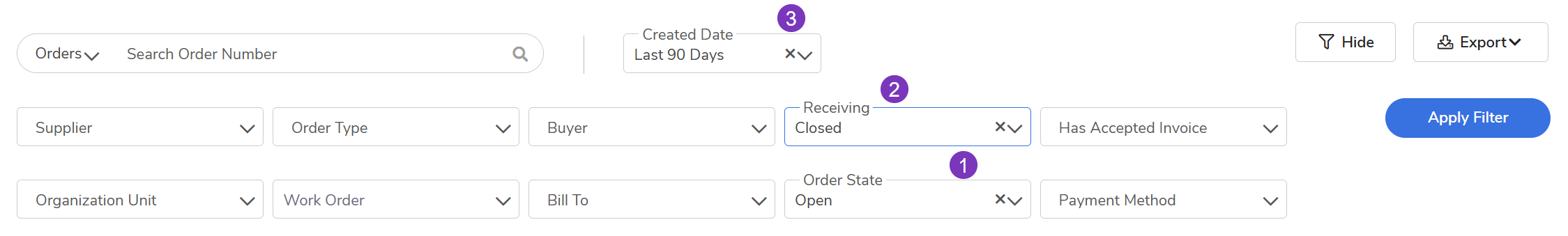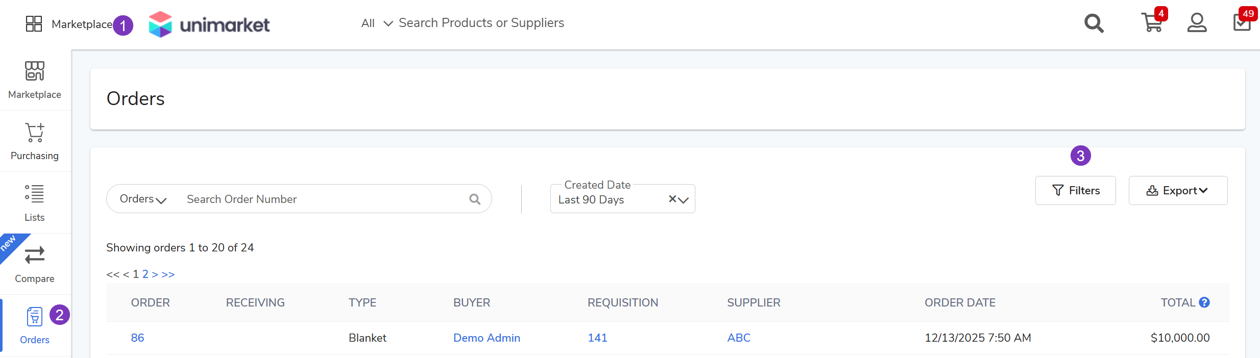 Filter Orders: Go to the Marketplace module > Orders > Filters.