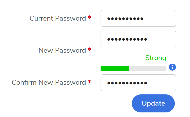Enter a New Password. The system will provide a strength indicator: Moderate (Yellow) or Strong (Green).