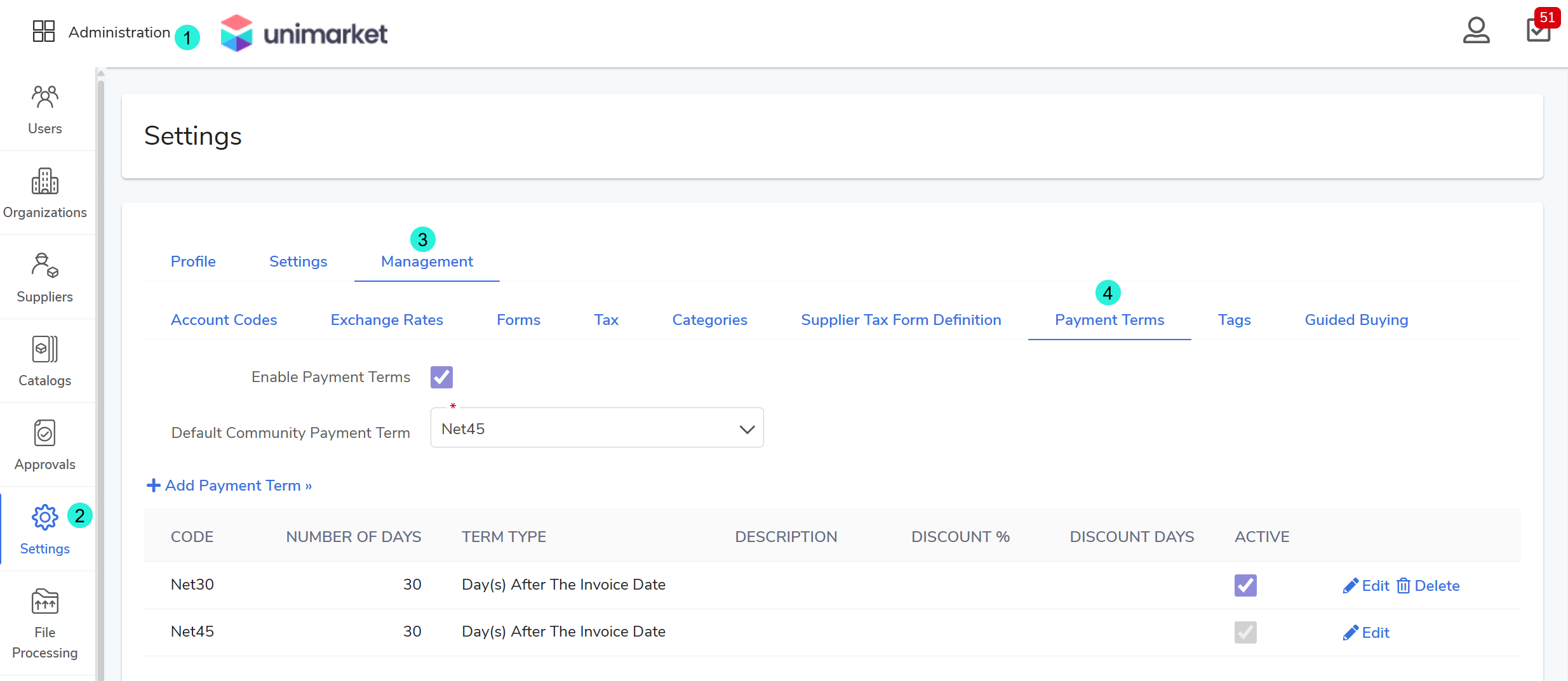In Unimarket, Payment Terms allow your community to automate the calculation of invoice due dates based on the invoice date. This ensures consistency in your financial obligations and can be integrated with your ERP system for seamless payment processing.