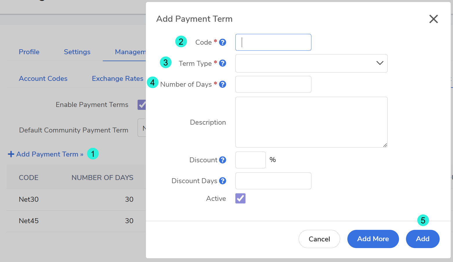 Add Term: Click +Add Payment Term and fill in the required fields: