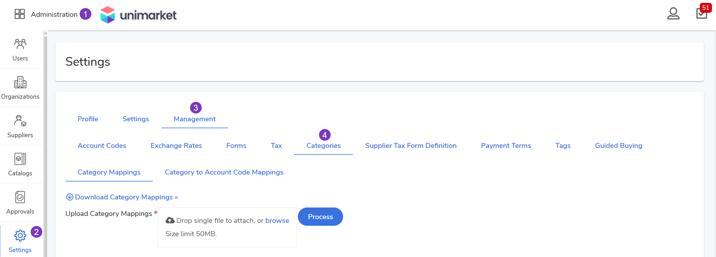 In Unimarket, Category Mapping allows your community to standardize product classifications. By mapping external codes or different UNSPSC versions to the Unimarket UNSPSC standard, you ensure that reporting and spend analysis remain consistent across all suppliers and systems.