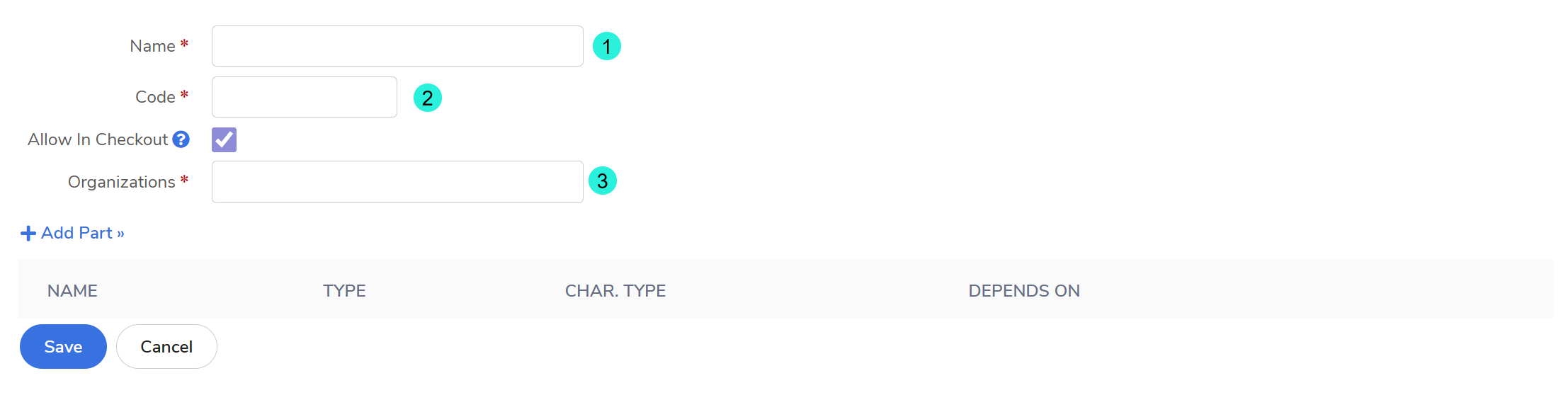 Global Settings: Provide a Name, Code and Organization. Check Allow In Checkout to make it visible to buyers.