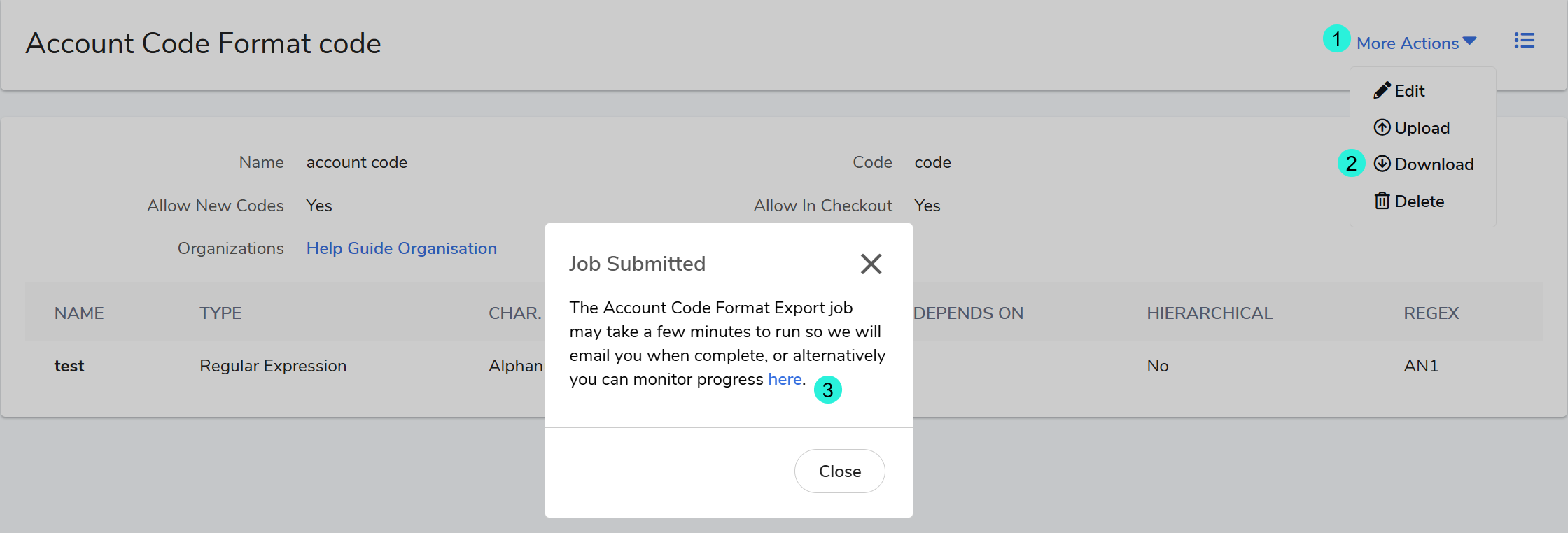Request Download: Select More Actions > Download. A pop-up will appear; click the "here" hyperlink to be directed to the Background Jobs area.